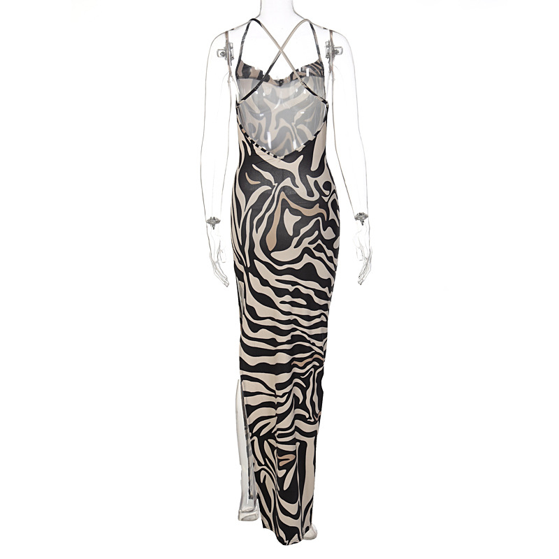 Style: Sexy Fit: Slim Fabric: Polyester Blends Pattern: Animal Print Element: Backless,Lace/Tulle/Fishnet,Split Neckline: Cowl Neck Sleeve Type: Others Sleeve Length: Sleeveless Product Type: Cami Dress,Maxi Dress,Split Dress Occasion: Party & Club Dress/Skirt Length: Maxi Main Composition: Polyester Season: Summer